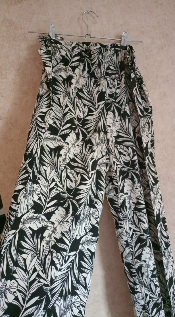 siyah desenli, bol kesim ve uzun boy kadın pantolonları, yumuşak sentetik kumaştan, pile detaylıdır ve bohem tarzı yansıtır.