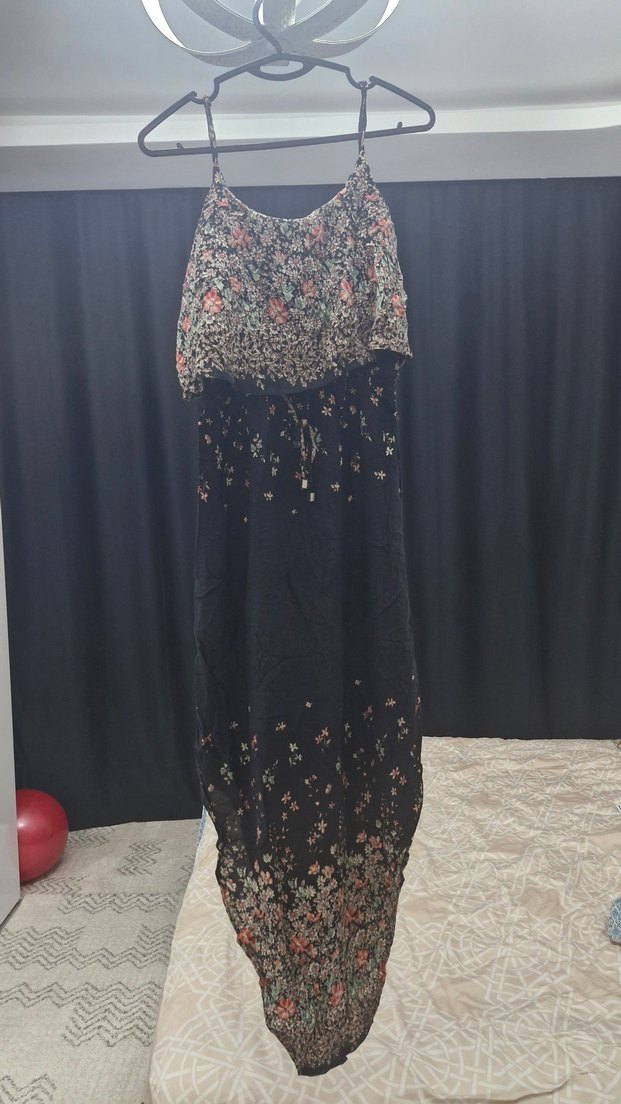 Siyah, çiçek desenli, askısız ve bol kesim uzun elbise. Yumuşak sentetik kumaştan yapılmıştır, günlük kullanım için uygundur. avustralyadan alınmıştır 1 sezon giyildi herhangi bir sıkıntısı yok M-L beden uyumlu