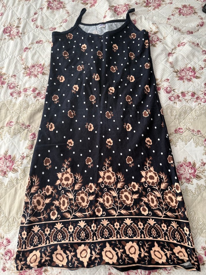 Siyah renkli, desenli bohem tarzda uzun elbise. Askılı, kolsuz ve bol kesim olup, dökümlü detaylara sahiptir. Sentetik kumaştan yapılmıştır, günlük kullanım için uygundur.