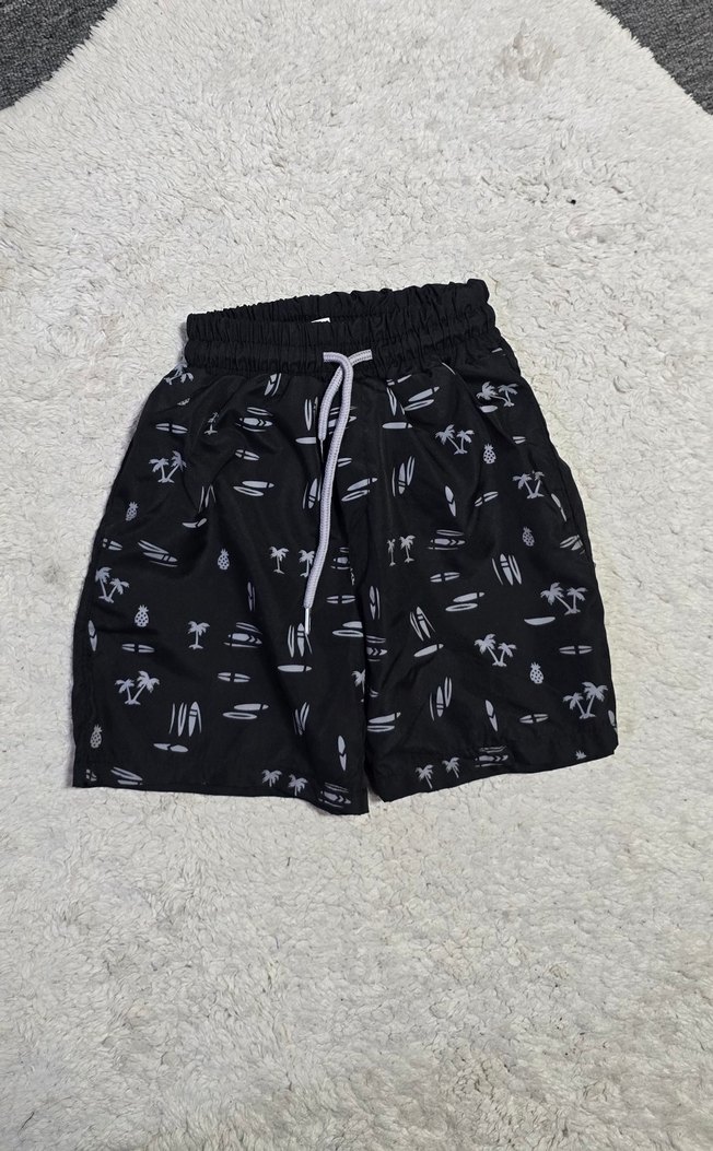 Siyah renkli, palmiye ve sörf tahtası desenli erkek çocuk deniz şortu, ayarlanabilir bağcıklı lastikli bel bandı ile. 6 ve 7 yasları kaldı