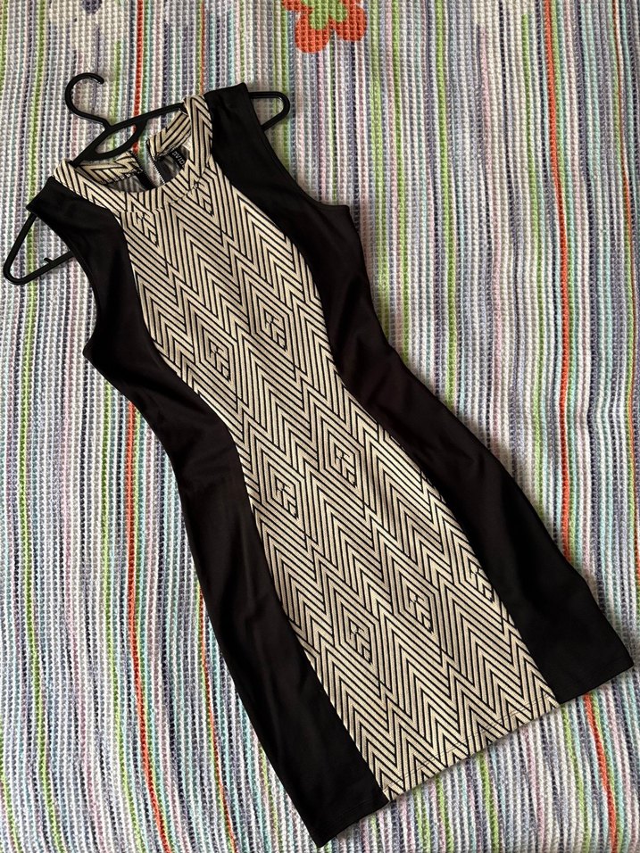 Siyah geometrik desenli kısa, üste komple oturan likralı oldukça rahat bir elbise, hiçbir kusuru yok