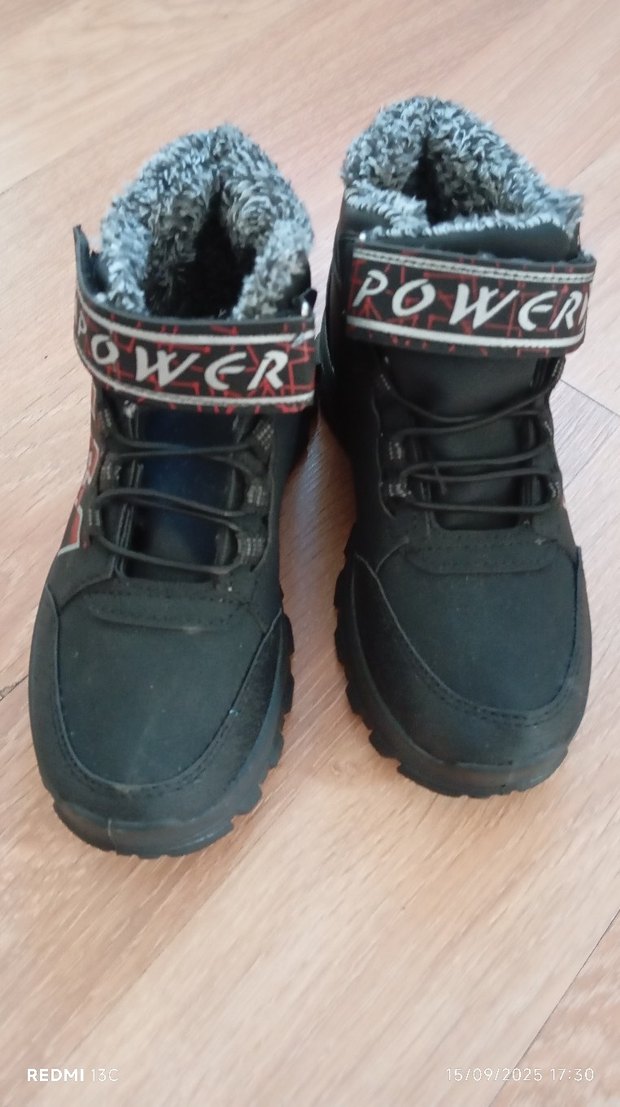 Siyah desenli, kauçuk malzemeden yapılmış, Velcro bantlı ve içi sıcak astarlı erkek çocuk botları. Sokak stiline uygun, trend bir tasarım. "POWER" yazısı bantta yer alır.