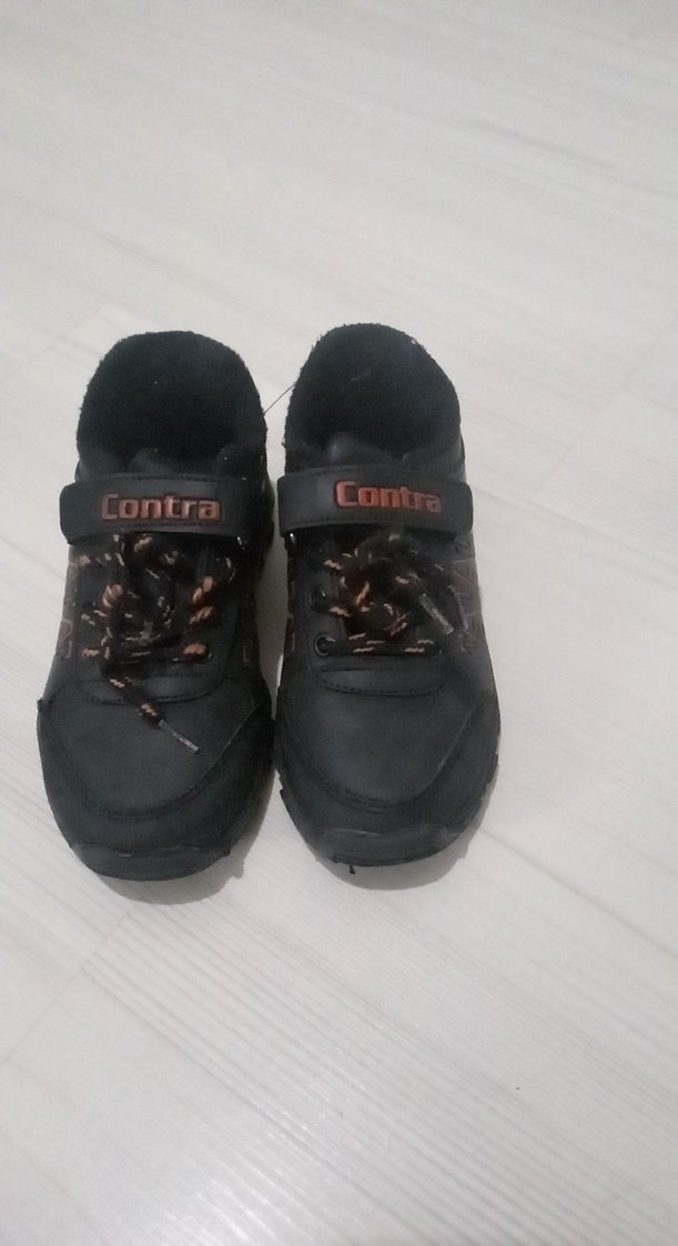 Kauçuk malzemeden yapılmış, siyah desenli erkek çocuk botu. Velcro bant ve bağcıklarla desteklenmiştir, "Contra" markalıdır.