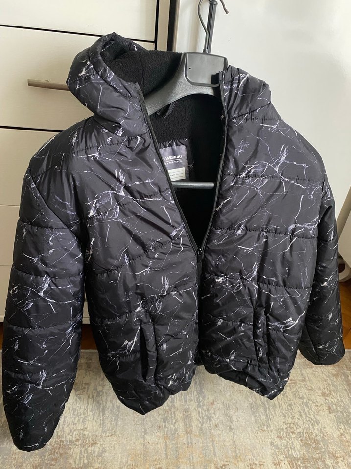 Erkek çocuklar için dar kesim, fermuarlı, siyah renkte ve hafif mermer desenli sentetik kumaştan mont. Notch yaka detaylı, sokak stili için uygun. Hiçbir sorunu kusuru yoktur tertemiz