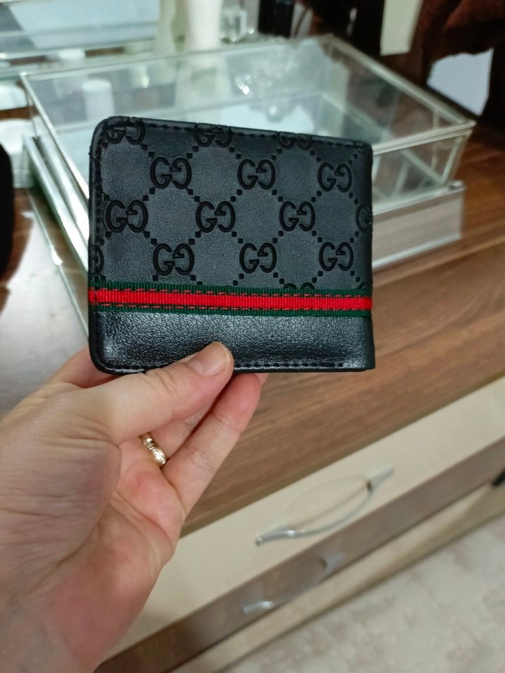 Koyu renk tonunda, baskılı desenli siyah erkek cüzdanı, kırmızı-yeşil şerit detaylı, streetwear ve iş tarzına uygun.