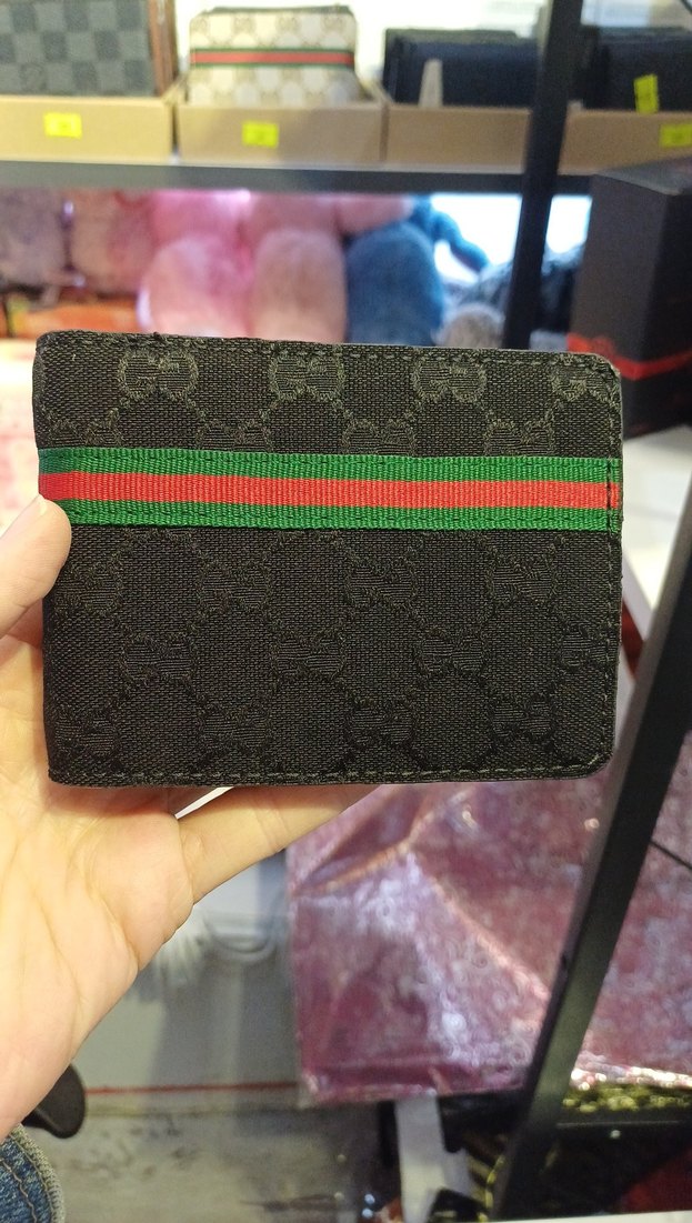 Erkek cüzdanı siyah renk ve desenli kumaş üzerine yeşil-kırmızı şerit detayına sahip, sokak modasına uygun tasarlandı.