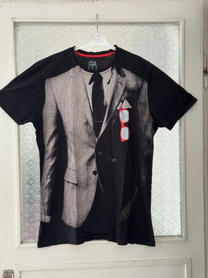 Siyah kısa kollu erkek tişörtü, baskılı takım elbise ve kravat deseni, kesik yaka ve düğmeli detaylı, sentetik kumaştan üretilmiştir. ️dikiş var belli belirsiz