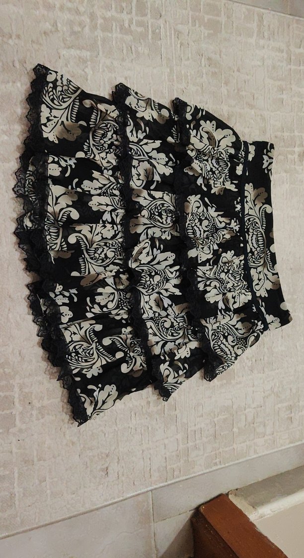 Siyah renkte, desenli tekstilden yapılmış, fırfır detaylı ve bol kesim vintage goth tarzı mini etek. Kısa boyda ve günlük kullanıma uygundur.
