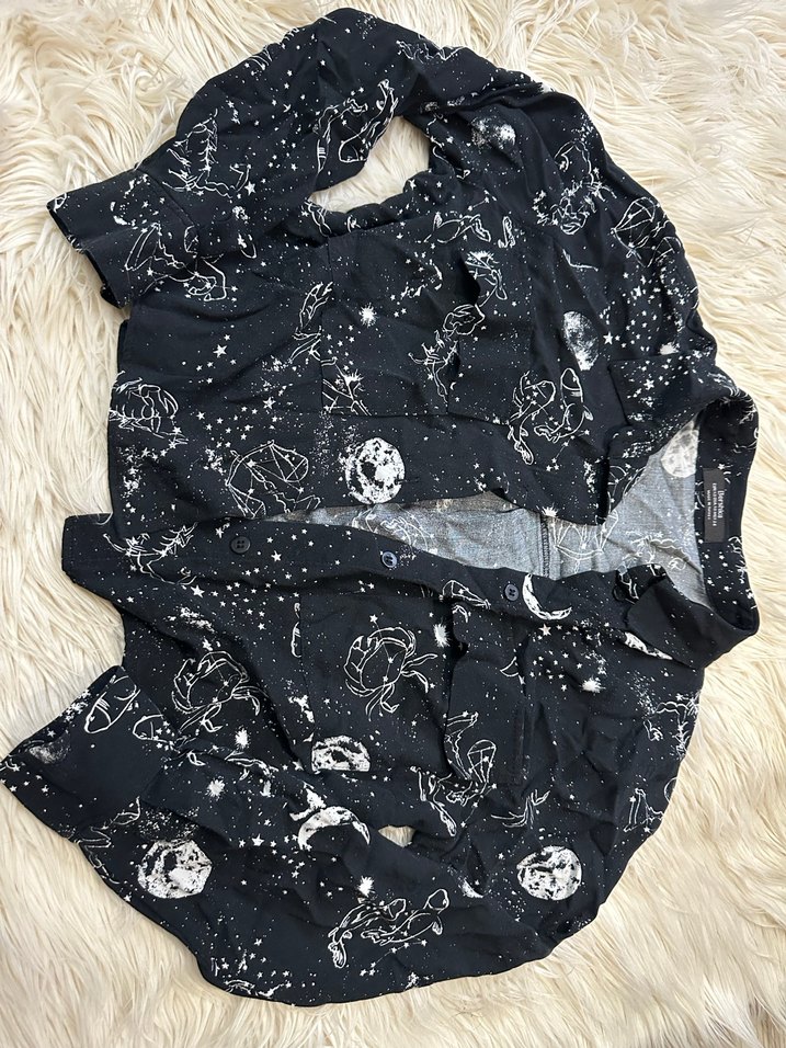 Gökyüzü desenli, uzun kollu, düğmeli ve yakalı siyah kadın gömleği. Gevşek kesim ve midi boy ile bohem ve gotik tarzları birleştirir. Günlük kullanım için uygundur.