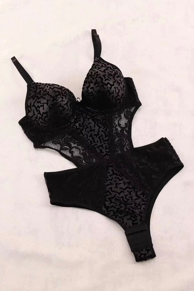 Siyah renkli, desenli ve dantel detaylı gotik tarzda kısa mini uzunlukta sütyen. Karanlık stil ve ince dokular bir arada.