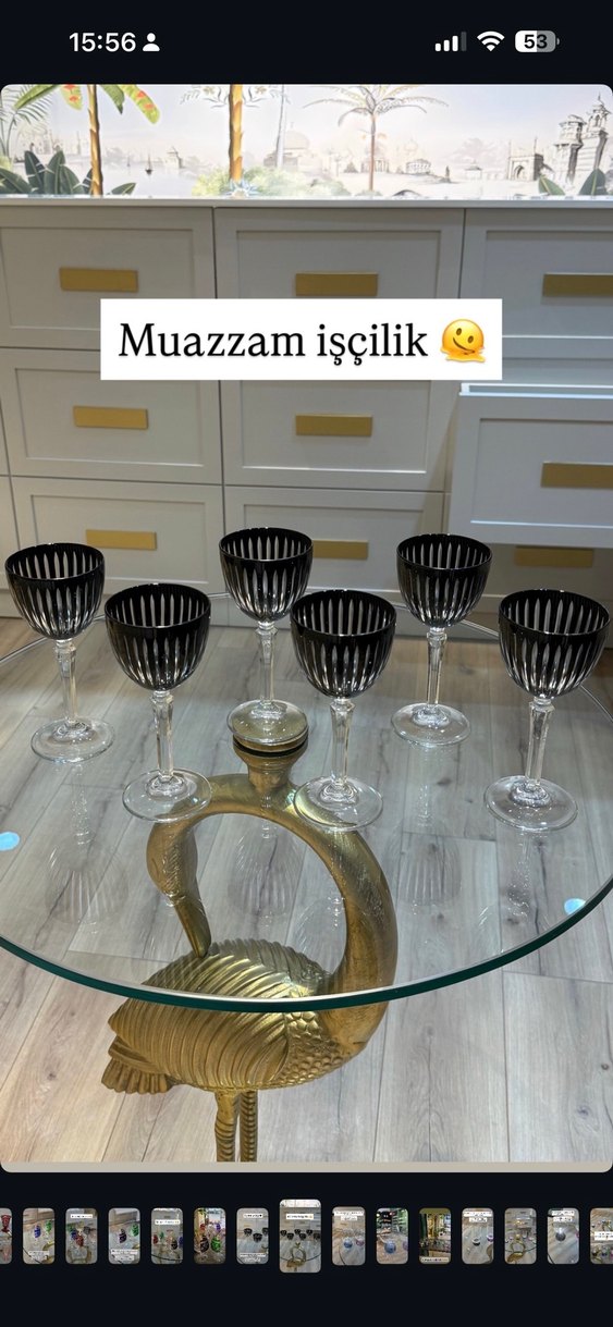 İnce işçilikle desenlendirilmiş siyah kadehler, şık saplarıyla içecek sunumuna zarafet katıyor.