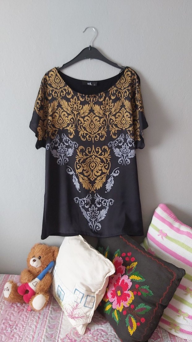 Siyah desenli, kısa kollu, yuvarlak yakalı ve dökümlü kesime sahip kadın bluz. İpeksi dokusu ve bohem gotik tarzıyla günlük kullanım için uygundur.