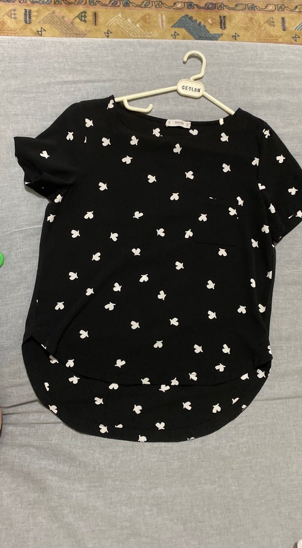 Kısa kollu, bol kesim ve yuvarlak yakalı siyah kadın bluz. Desenli ve sentetik kumaştan, günlük rahat