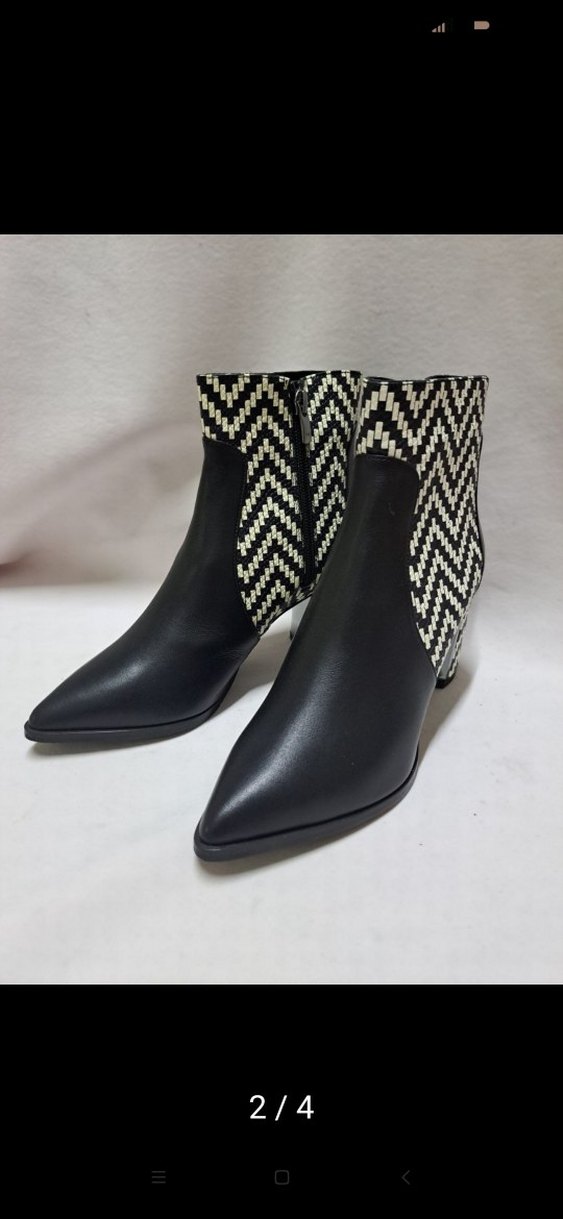 Kadın botları, blok topuklu ve siyah-beyaz zebra desenli örgü detaylıdır. Deri malzemeden yapılmış, çağdaş ve modaya uygun tasarım sunar.