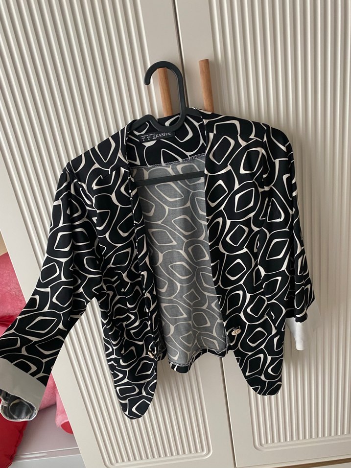 Düğmeli, siyah ve baskılı kadın ceket. Bol kesim, uzun kollu, V yaka ve kısa boyda, sentetik kumaştan üretilmiştir. Trendy günlük kullanım için uygundur.