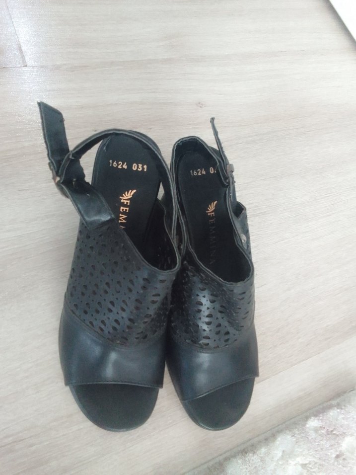 Siyah renkli, desenli ve tokalı bantlı kadın dolgu topuklu sandalet ayakkabı. 37/38 numara