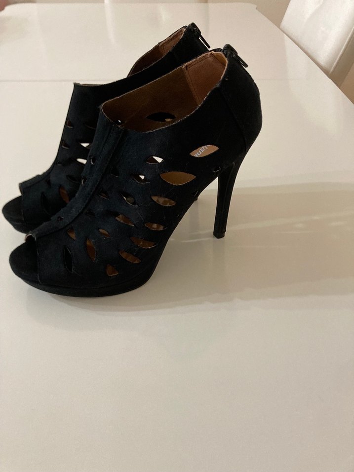 Siyah desenli, platform , fermuarlı, süet deri malzemeden kadın kalem topuklu ayakkabılar. Gotik tarzıyla romantik akşamlar için uygun.