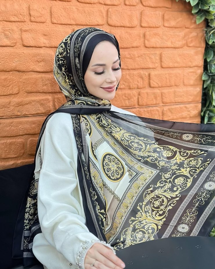 Siyah renkte, drapeli ve bohem desenli kadın şalı, yumuşak sentetik kumaştan yapılmıştır ve mütevazı, geleneksel bir tarz sunar.