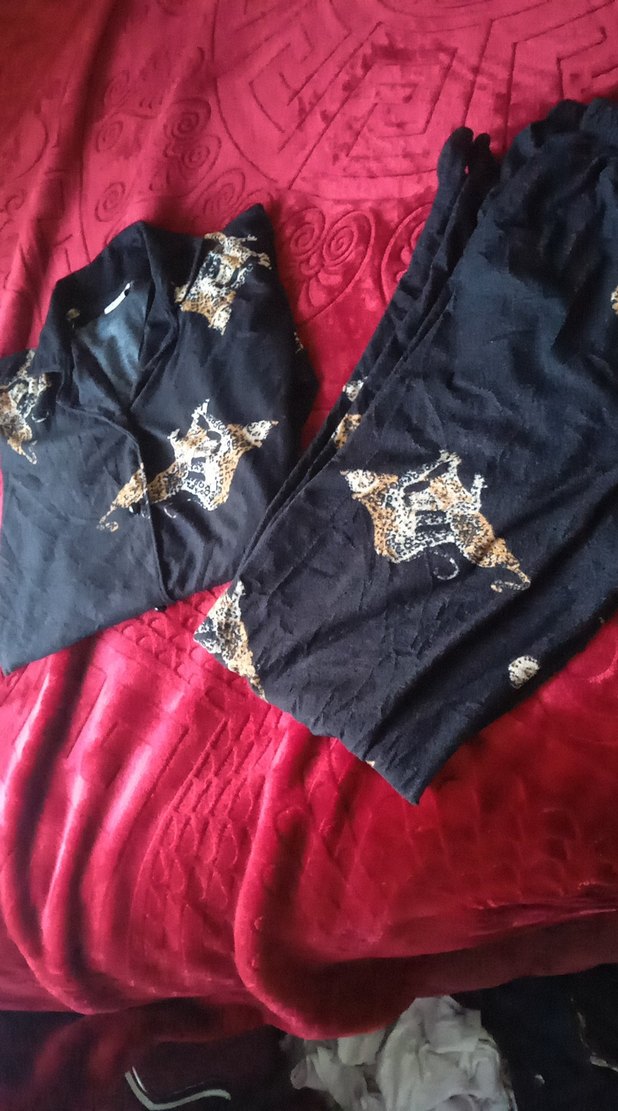 Siyah zemin üzerine desenli, saten kumaştan kadın pijama takımı. Salaş kesim, drapeli tarz, yakasında kesik ve askılı kollarıyla rahat ve şık. leoparlı desenli sadece bir yada iki defa kullanıldı yep yeni gibi