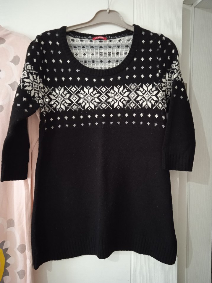 Siyah renkli, desenli triko kazak, yuvarlak yaka ve uzun kolludur. Salaş kesimi ve midi boyu ile rahat kullanım sunar. midi boy ve fakir koldur,önünde parlayan boncuklarla çok şıktır,az kullanıldı,kusursuz.