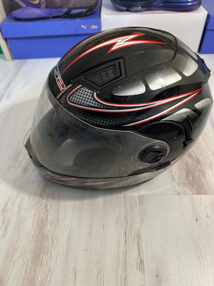 Kırmızı detaylı desenli siyah motosiklet kaskı, kemerli kapama ile sokak stili biker havası sunar. ️