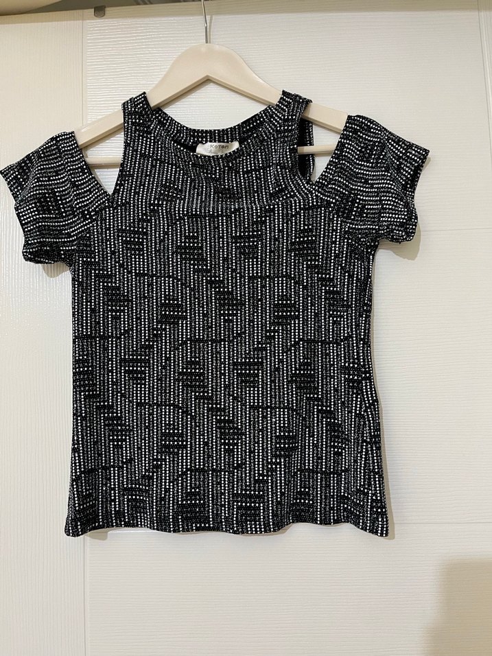 Kız çocuk için kısa kollu, kesik detaylı ve kayık yaka model bluz. Siyah ve gri desenli, örme sentetik kumaştan üretilmiştir. Trendy rahat stil için uygundur.