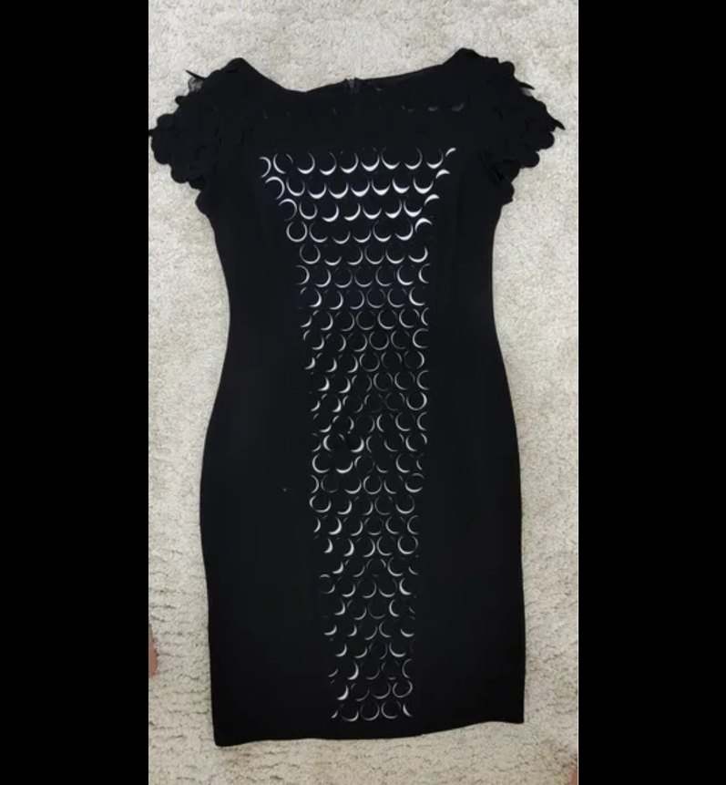 Siyah renkli, kısa kollu ve tekne yakalı, desenli uzun ve vücuda oturan elbise.
