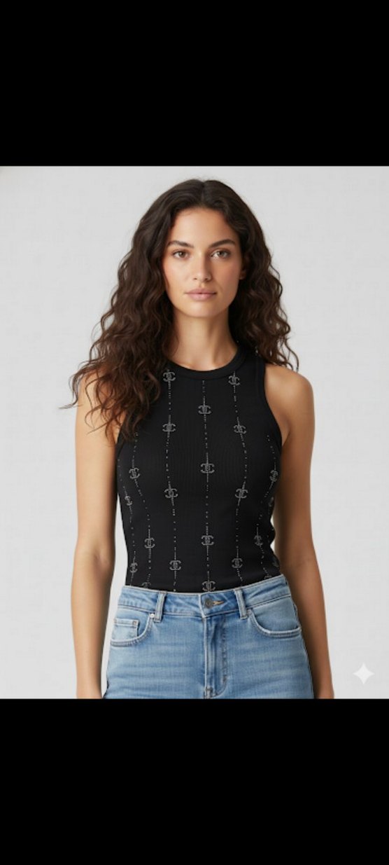 Yumuşak denim kumaştan, kolsuz ve yüksek yakalı, siyah desenli, dar kesim kısa crop top.