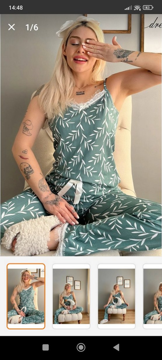 siyah pastel yaprak desenli, kolsuz mini üst ve pantolondan oluşan bol kesim kadın pijama takımı, rahat bohem tarz sunar.