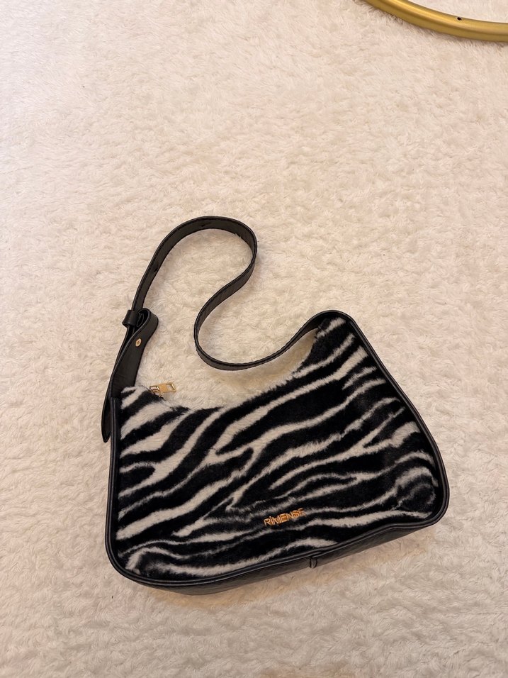 Siyah deri çanta, zebra desenli ve kürklü detaylara sahip, trendy günlük kullanım için. Fiyat Sorunuz toplu ya da tek tek alabilirsiniz