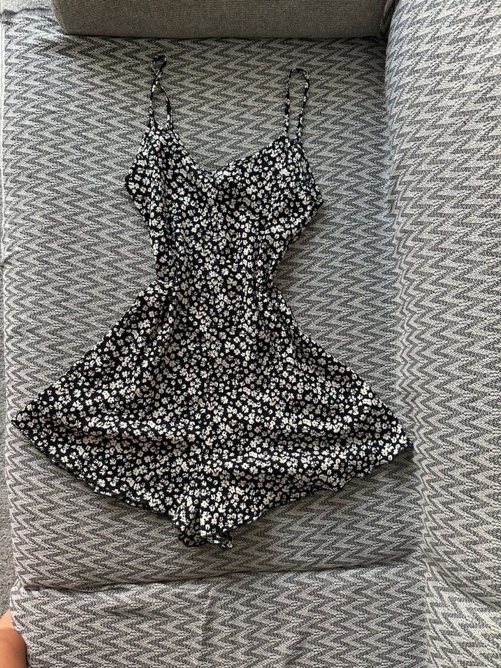 İnce askılı, V yaka ve küçük çiçek desenli siyah mini tulum sentetik yumuşak kumaştan, günlük kullanıma uygun şık bir parça. Ürün sadece bi kere giyildi yeni durumda
