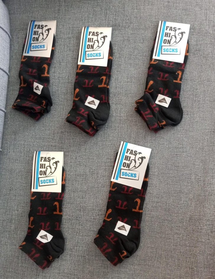 Siyah renkli, desenli, kısa boylu ve bol kesim erkek çorapları. Etiketinde 'FAS, ON, SOCKS, SOEKS, DA' yazısı bulunmaktadır.