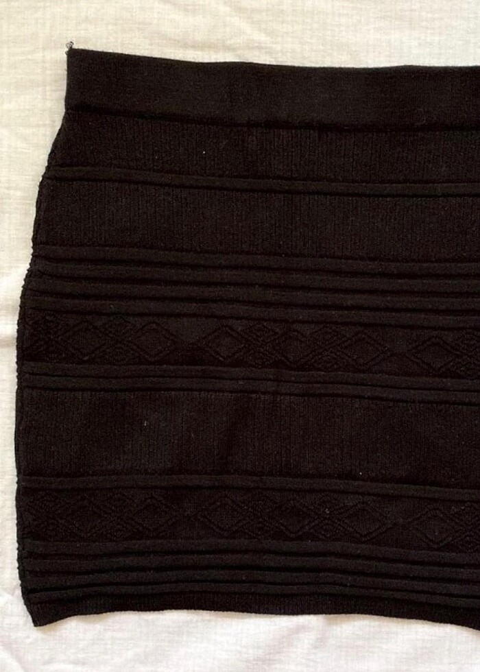 Bir iki kez giyildi. Trikoya benzer bir kumaşı vardır. Çok hafif bir etek. Spor ayakkabılarla çok güzel duruyor. Boyu 39cm e daha yakın resimde belirttim.