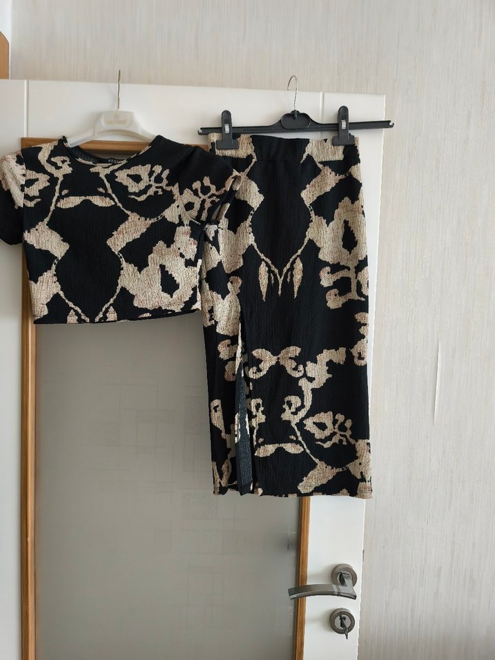 Siyah renkte, baskılı tekstil kumaştan, bol kesim ve drapeli kısa eteği. Güncel tarzıyla ofis kullanımı için uygundur.