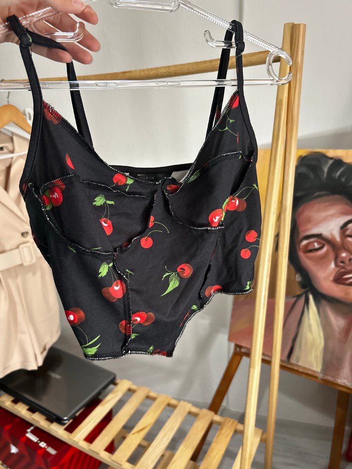 Dar kesim siyah büstiyer, baskılı kiraz deseni ve düğmeli, ince askılı, sokak modasına uygun.
