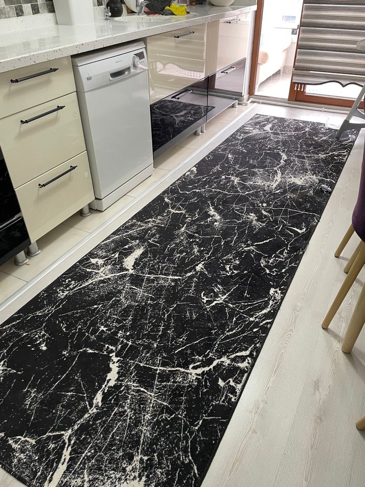 Bu modern mutfak halısı, siyah zemin üzerine beyaz desenli baskıya sahiptir ve mutfağa şık bir dokunuş katar. Uzun ve dar formdadır.