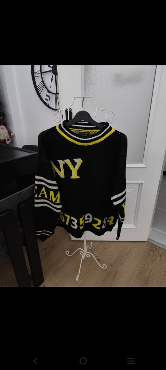 Siyah örgü kumaştan, uzun kollu, bisiklet yaka ve bol kesim kadın kazak Üzerinde 'NY' ve sayılar baskılıdır, günlük kullanıma uygundur.