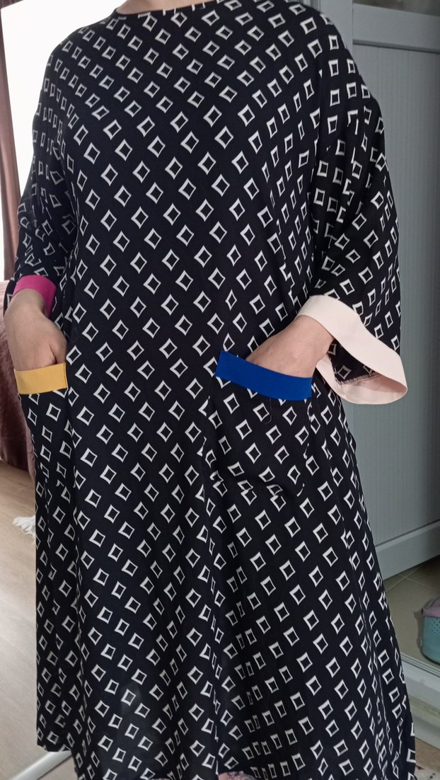Siyah renkte, deseni olan uzun ve bol kesim salaş tunik Cep kenarlarında renkli detaylar bulunur.