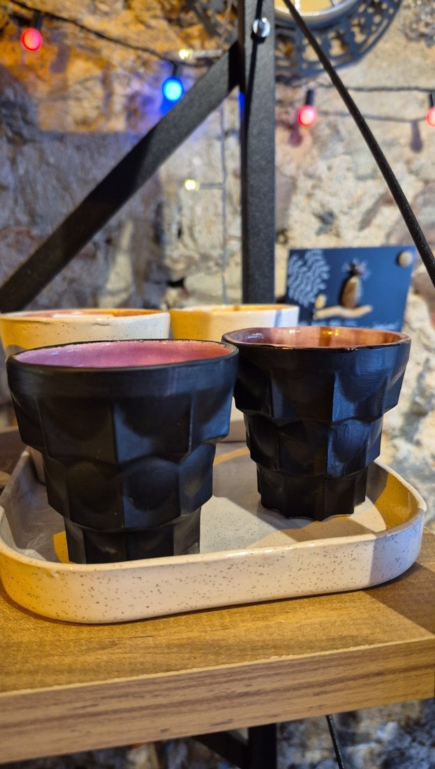 1 adet siyah seramik bardak, dışı desenli ve içi canlı renkte. Hafif tepsi üzerinde şık ve özgün tasarımlı bardaklar. ☕