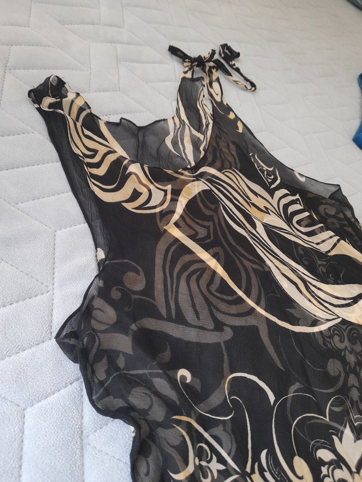 Siyah, desenli, ipek gibi dokusu olan şifon, kolsuz etek ucu üçgen tek omuz fiyonklu pareo göğüs 53 boy 76 cm