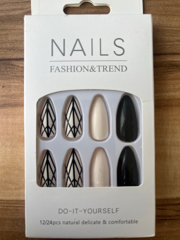 Siyah ve desenli tırnak süslemeleri. 24 parçadan oluşur ve doğal, rahat kullanım sağlar. Kendi tırnak tasarımınızı yapabilirsiniz.