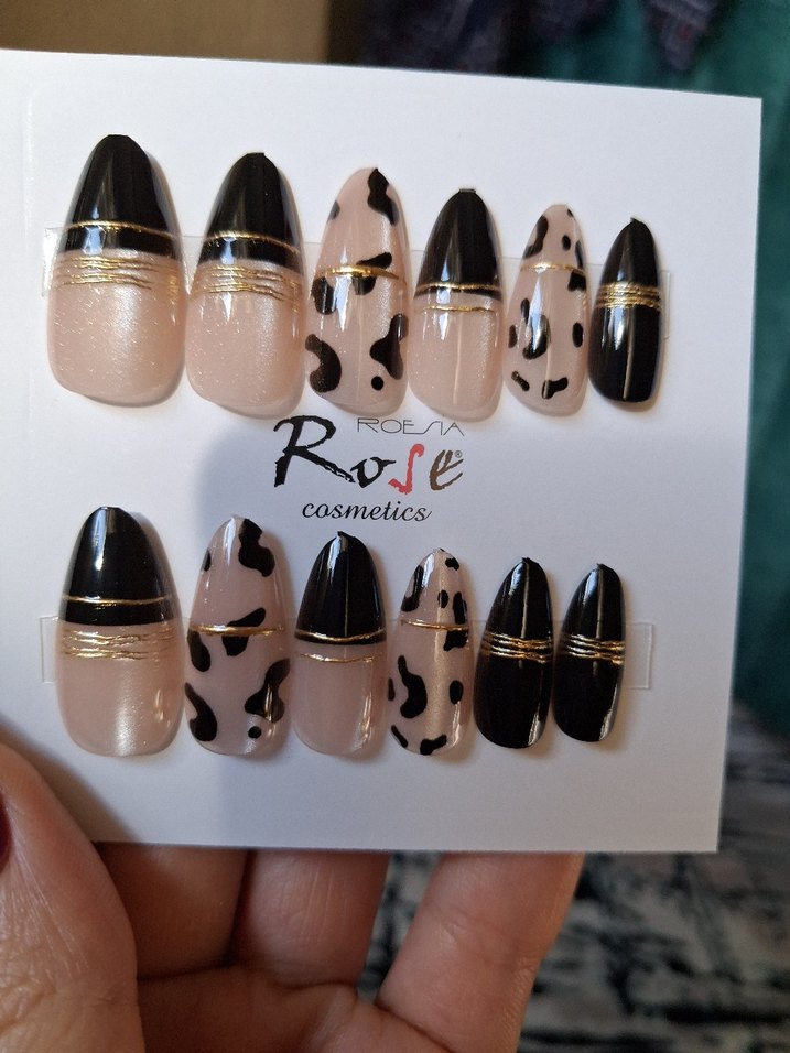 Rose Cosmetics'ten altın detaylı siyah ve desenli tırnak süslemeleri. Şık bir görünüm için ideal.