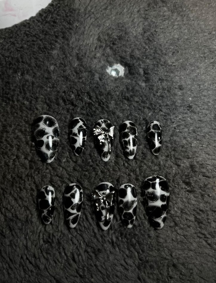 Parlak görünümlü, siyah desenli tırnak süslemeleri, farklı tasarımlarla şık görünüm sunar.