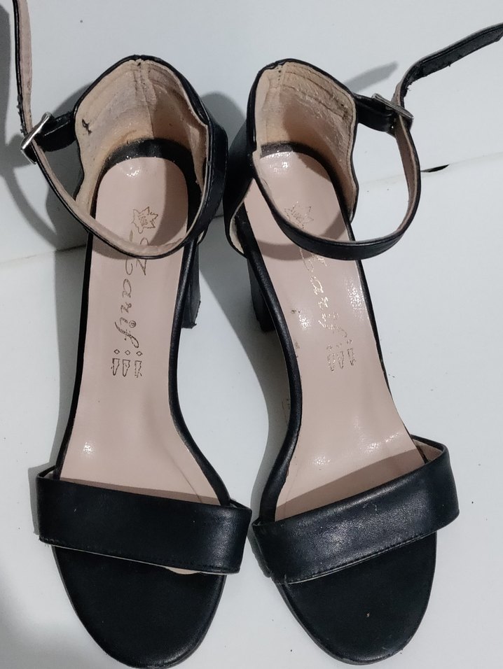 Siyah desenli, tokalı bilek bantlı topuklu bayan ayakkabı. Dayanıklı kauçuk malzemeden, günlük kullanıma uygun olup herhangi bir deformesi veya yırtığı yoktur.