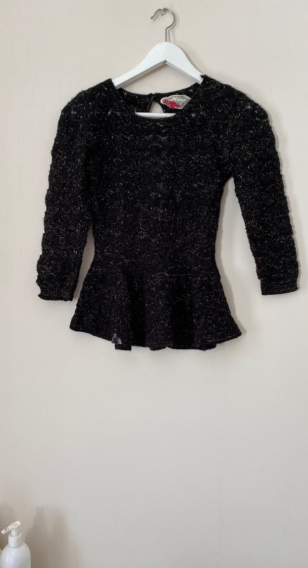 siyah renkli, uzun kollu, desenli triko kazak. Dar kesimi ve bisiklet yaka tasarımıyla dikkat çeker.