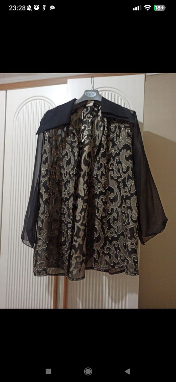 Uzun şeffaf kollu, straplez ve bol kesim ceket, koyu tonlarda desenli ve ipeksi kumaştan yapılmıştır,