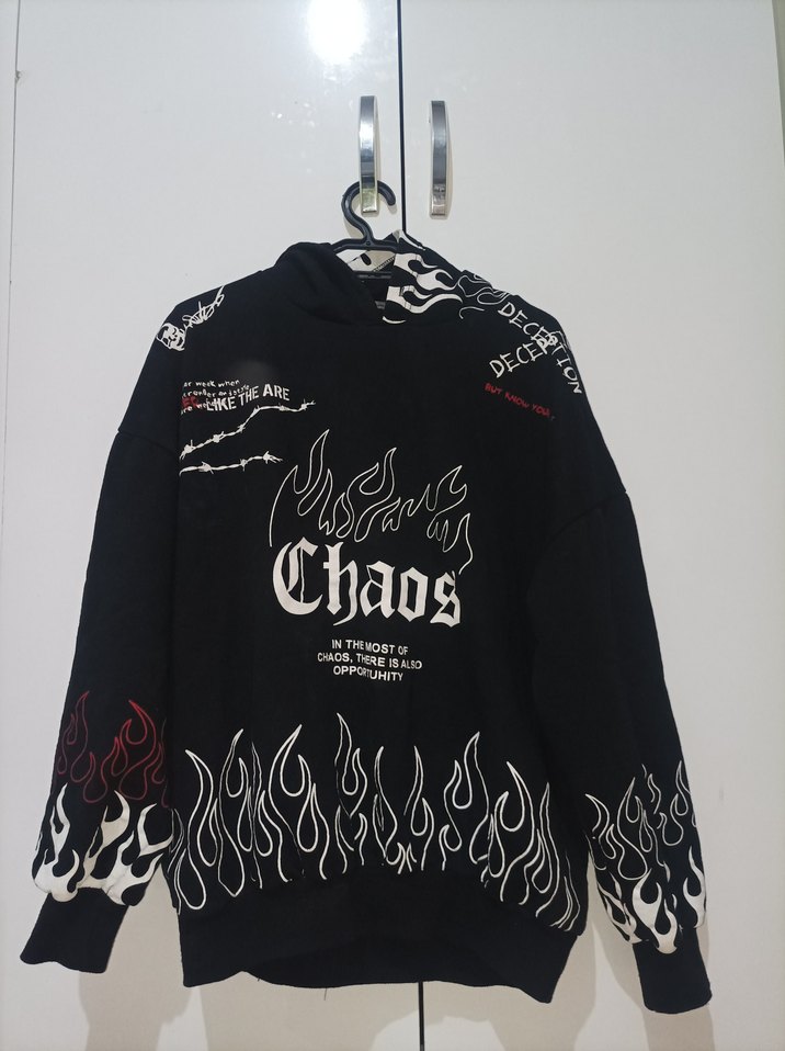 Siyah, uzun kollu,. Önünde 'Chaos' baskısı ve alev desenleri bulunur.Sokak tarzını yansıtır. S beden dar kalıp