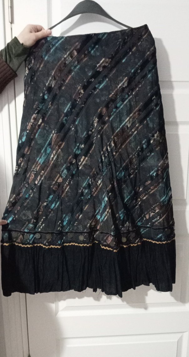 Siyah, koyu batik desenli, drapeli ve bol kesim uzun bir etektir. Yumuşak tekstil malzemeden üretilmiş olup, günlük kullanıma uygundur.