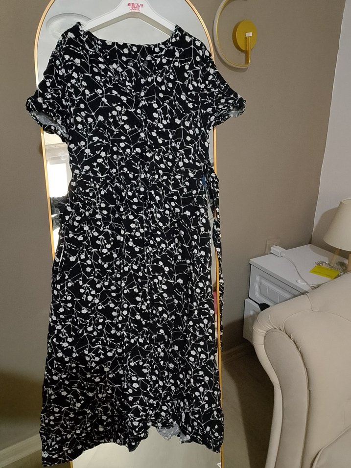defosu gösterildi!!! Siyah renkli, uzun ve salaş kesim kadın elbisesi, kısa kollu. düğmeli ve desenlidir. Bel detayı ve straplez yakasıyla günlük sokak modasına uygundur.