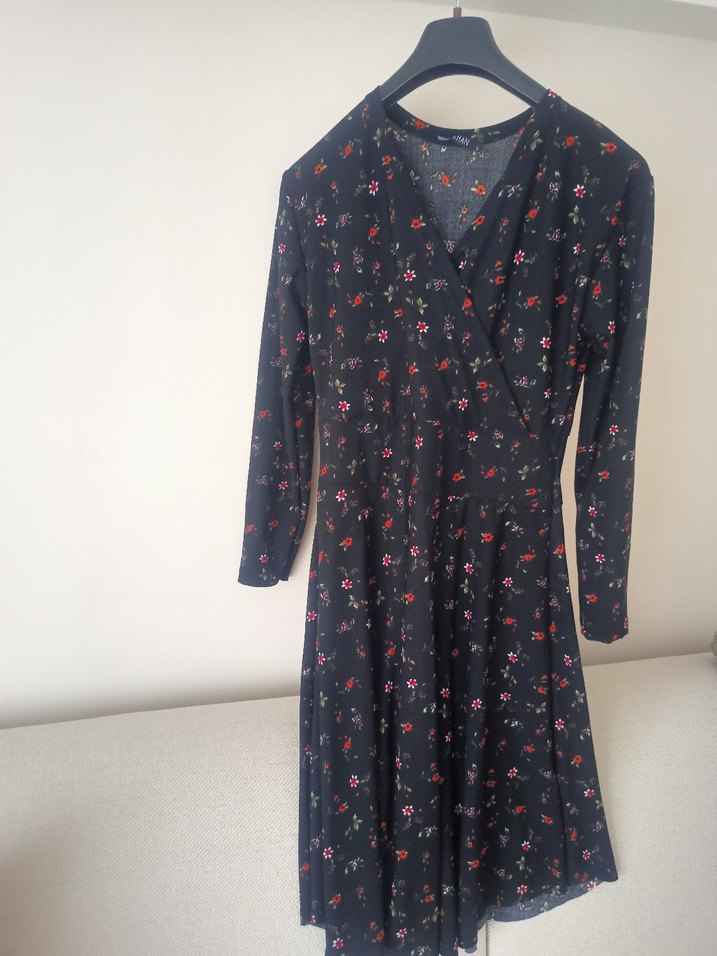 Siyah midi elbise, uzun kollu ve drapeli tasarıma sahip. Çiçek desenli ve kruvaze yaka, rahat ve trend bir görünüm sağlar.